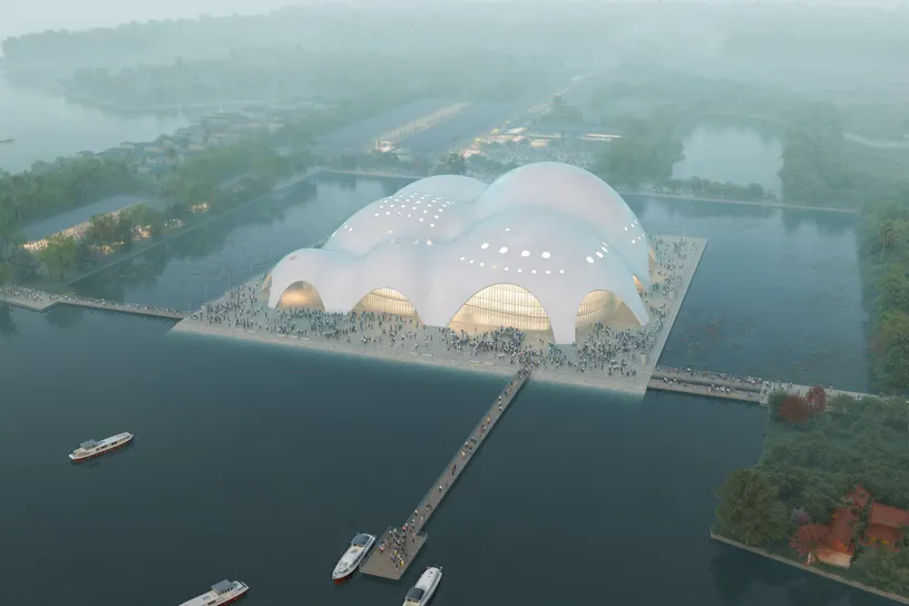 Conceived as a deep study of mathematic models existing in nature and not just as a formal gesture, the building emerges from the lake’s waters with its mother-of-pearl gentle shapes. It shelters performance and public spaces on a new island overlooking both West Lake and Đam Tri Lake. Suddenly a new entity becomes part of the Hanoi West Lake, visible from all the shores.